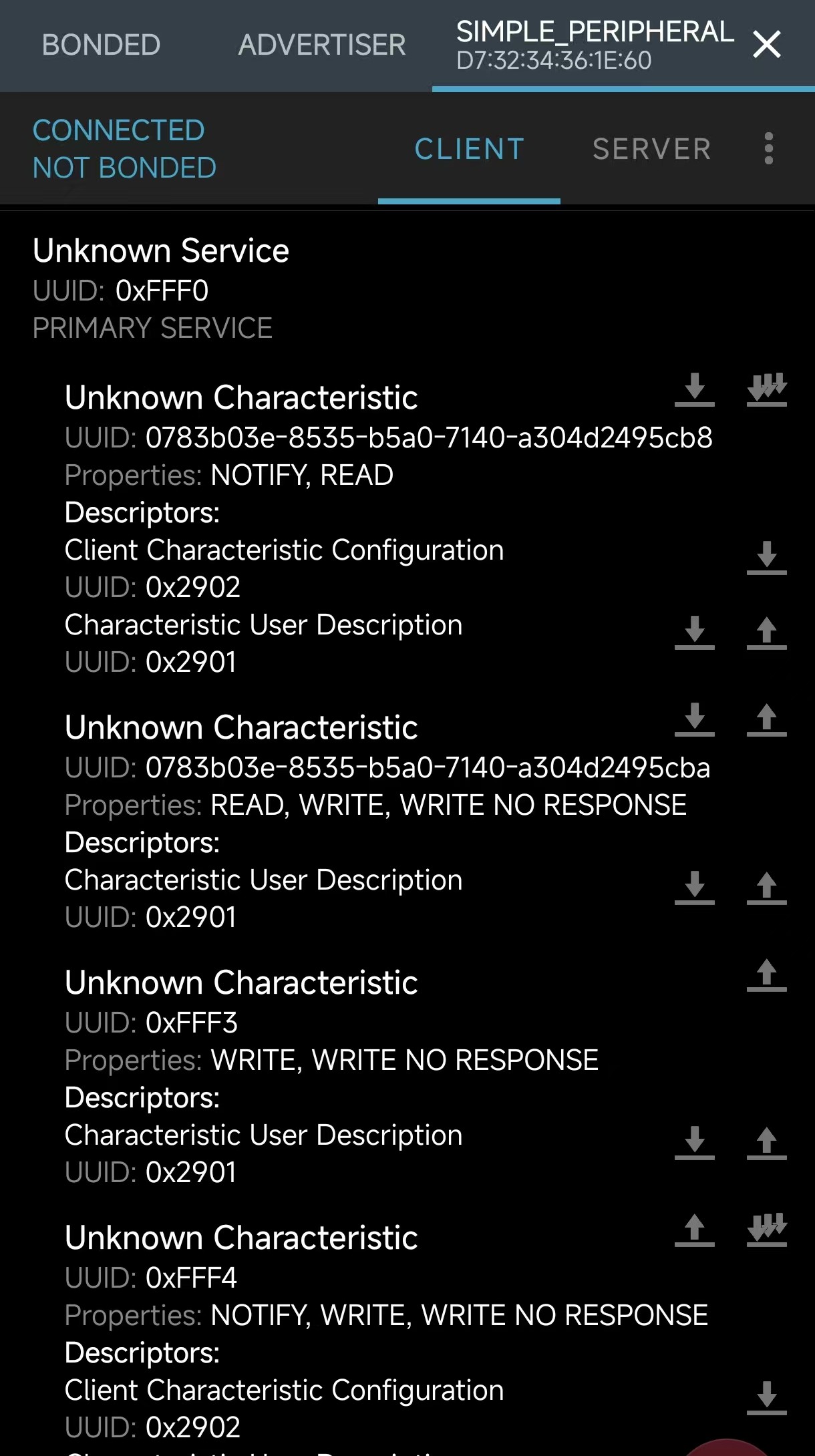 Descriptors(描述符)属于某些特性,并且可以包含诸如针对该特性的文本描述之类的元数据,或者可能提供一些控制该特性行为的方法。特性可以附带零个或多个描述符。例如,GATT 定义了一个名为“特征值通知”的操作,该操作涉及设备异步地向连接的对等设备发送包含特征值的 ATT 数据包,并且不需要对方设备的响应。如果一个特性支持通知,则通常会在特征值发生变化时或按照定时器控制的方式定期发送通知。但只有在对等设备请求时才会发送通知,这是通过在特定类型的描述符(称为“客户端特征配置描述符”)中设置一个标志来实现的,如果特性支持通知,则必须具有该描述符。
